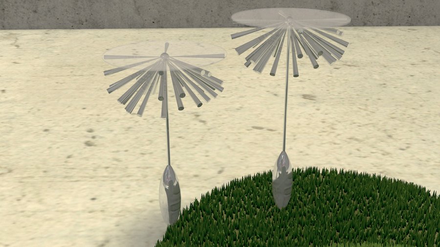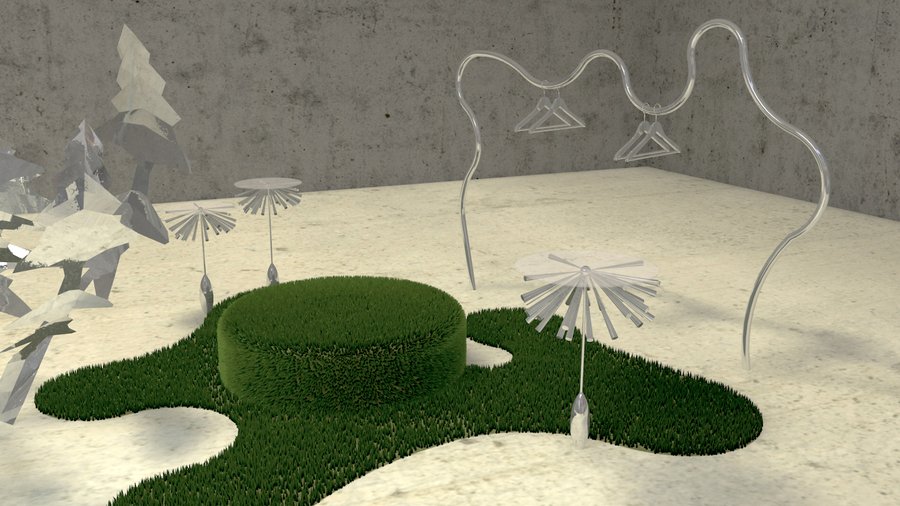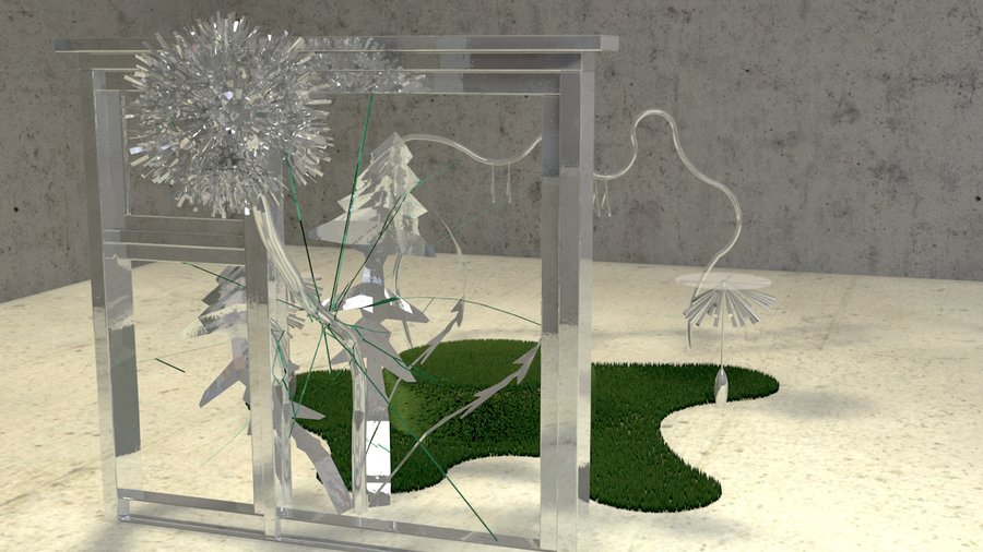 Идея: одуванчик пробивается сквозь разбитое стекло оконной рамы. Инсталляция символизирует силу и стойкость природы, которая находит способ пробиться даже в самых трудных условиях, это отсылает к творчеству дизайнера и художницы.
