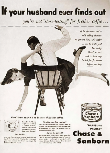«Если ваш муж когда-нибудь узнает…что ты не ходишь в магазин за свежим кофе…». На плакатах 50-х годов зачастую встречается сюжет с физическим доминированием мужчины над женщиной. Это могут быть шлепки (как на левом плакате) или другие способы, которые будут рассмотрены ниже. Таким образом, женщина не только обслуживала своего мужа, но и находилась игрушкой в его руках.