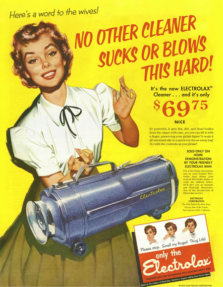 Рекламный плакат пылесоса Electrolax 1955 года продублирован с обложки в этом разделе неспроста: провокационный слоган смотрится оскорбительно рядом с женщиной. «Вот несколько слов для жен: ни одно другое чистящее устройство не всасывает и продувает так сильно!»