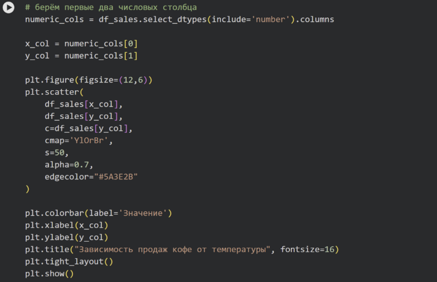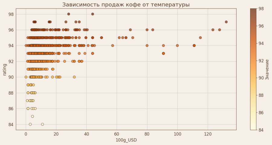 Исследование продаж кофе в зависимости от температуры показало обратную зависимость: при повышении температуры воздуха объёмы продаж кофе постепенно снижаются.