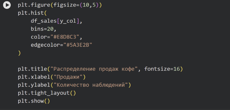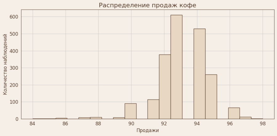 Гистограмма демонстрирует распределение объёмов продаж кофе за весь период наблюдения. Основная масса значений сосредоточена вокруг среднего уровня, однако также наблюдаются отдельные пики спроса. Такие всплески, как правило, приходятся на утренние часы и рабочие дни.