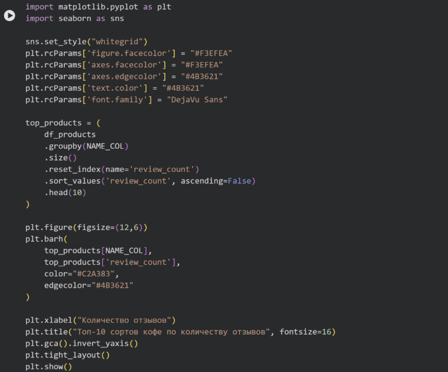 Данные были загружены из CSV-файлов через платформу Google Colab. Для преобразования столбцов с числовыми значениями, таких как рейтинг, количество отзывов и объём продаж, в числовой формат использовался метод pd.to_numeric библиотеки Pandas.