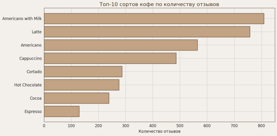 Горизонтальная столбчатая диаграмма показывает напитки, которые получили наибольшее количество пользовательских оценок. Как правило, это классические кофейные напитки — латте, капучино и американо.