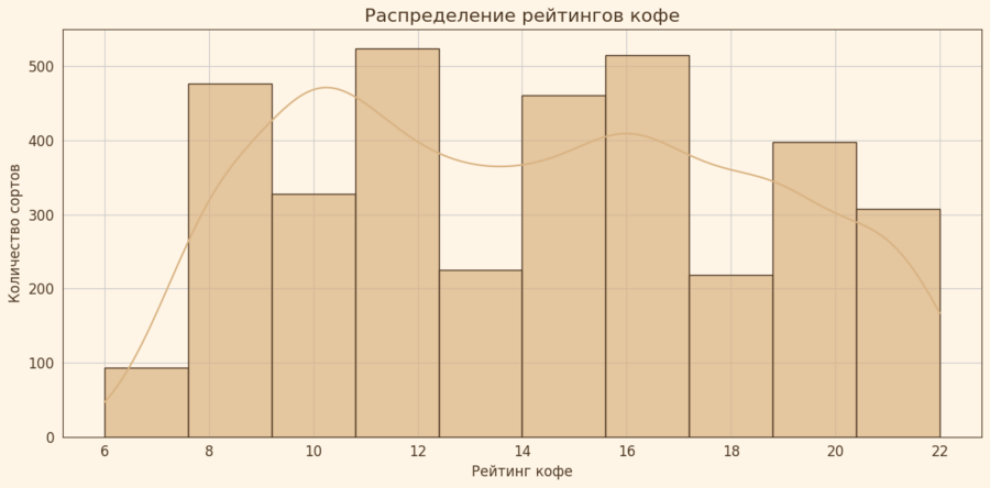 График показывает, что большинство сортов кофе получают средне-высокие оценки, что можно использовать для дальнейшего анализа, например, для выбора наиболее популярных сортов для промо-акций или рекомендаций