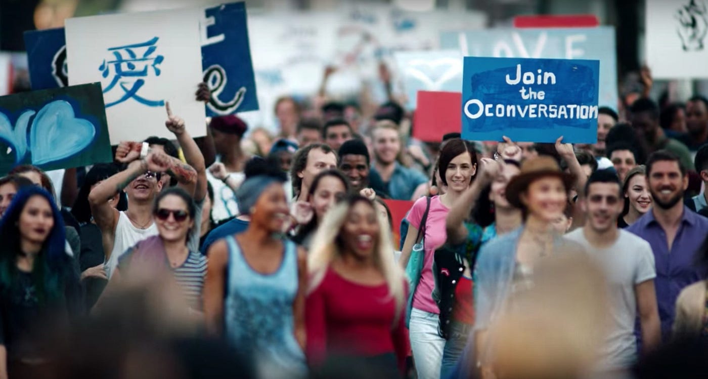Визуальный ряд ролика представляет собой тщательно срежиссированную сцену, изображающую мирный, почти утопический протест. Молодые люди, представляющие различные расовые и этнические группы, маршируют, улыбаются, танцуют и играют на музыкальных инструментах[1], в отличие от реальных протестов, где зачастую присутствуют гнев, конфликт или ощутимая опасность.