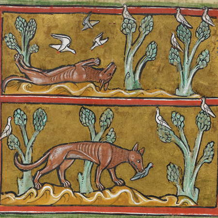 Птицы садятся на лису и она сразу хватает их. Этот хищник в бестиариях является аллегорией дьявола, который также всячески пытается усыпить бдительность людей и проявляет свою сущность только, когда человек уже в ловушке греха.