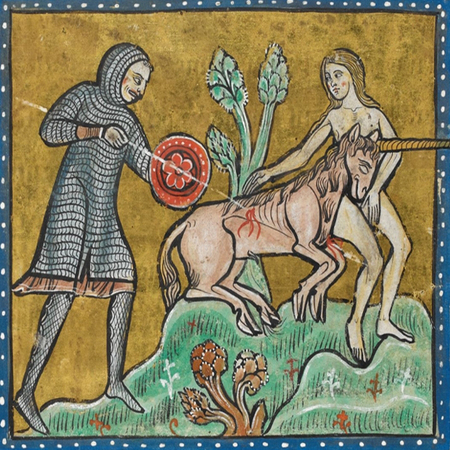 Его называли свирепым зверем. Поймать его могла только девственница. Единорог клал рог ей на колени и засыпал, в этот момент охотник подкрадывался и убивал его. Иногда единорог воплощал собой Иисуса Христа, который свирепо борется с дьяволом. Единый рог олицетворял соединение в Иисусе божественной и человеческой природы.