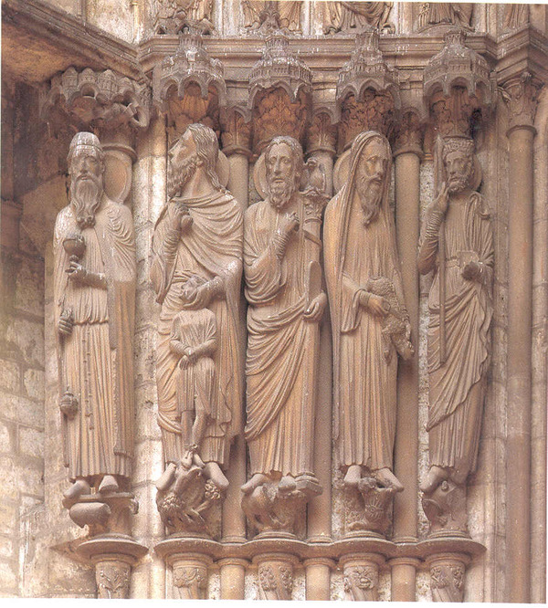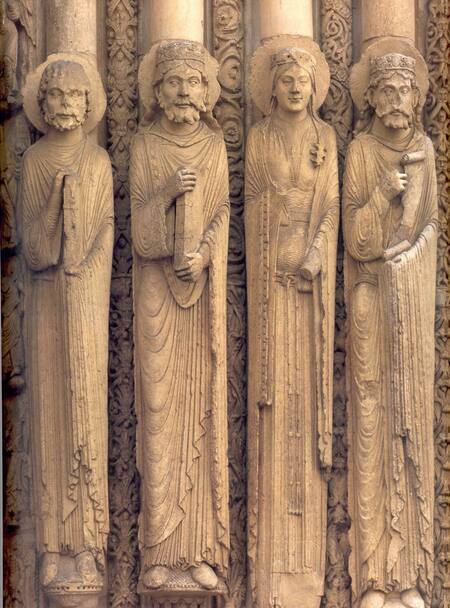 Фигуры апостолов, пророков и царей являются статуями-колоннами. Их тела удлинены и жестко привязаны к колонне, сохраняя цилиндрическую форму.