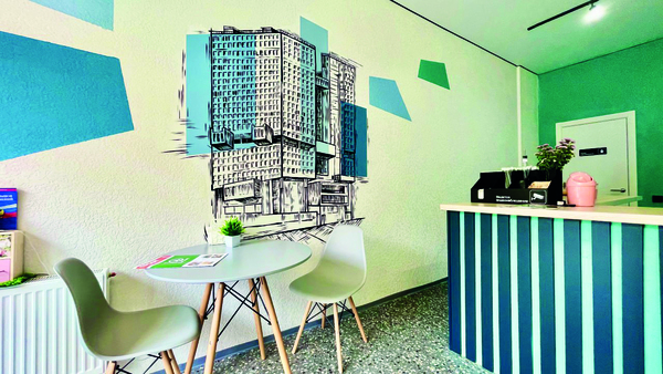 Стена с фотографиями здания от Юли Власовой в «Баре Советов»