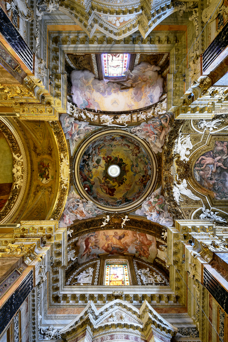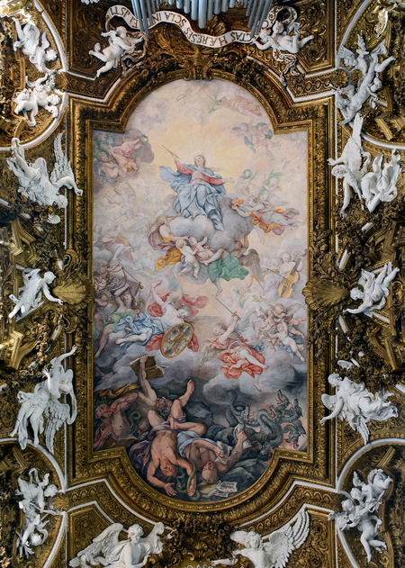Композиция на своде церкви Санта-Мария-делла-Витториа изображает Марию на небесах среди ангелов и падение злых духов во главе с Люцифером. Фигуры ангелов выходят из картины в виде скульптур, продолжая сюжет за пределами живописи. [11]