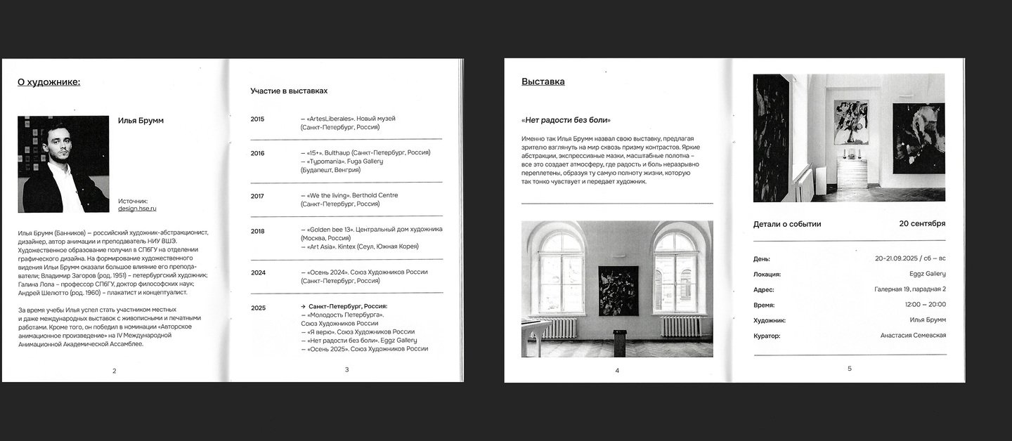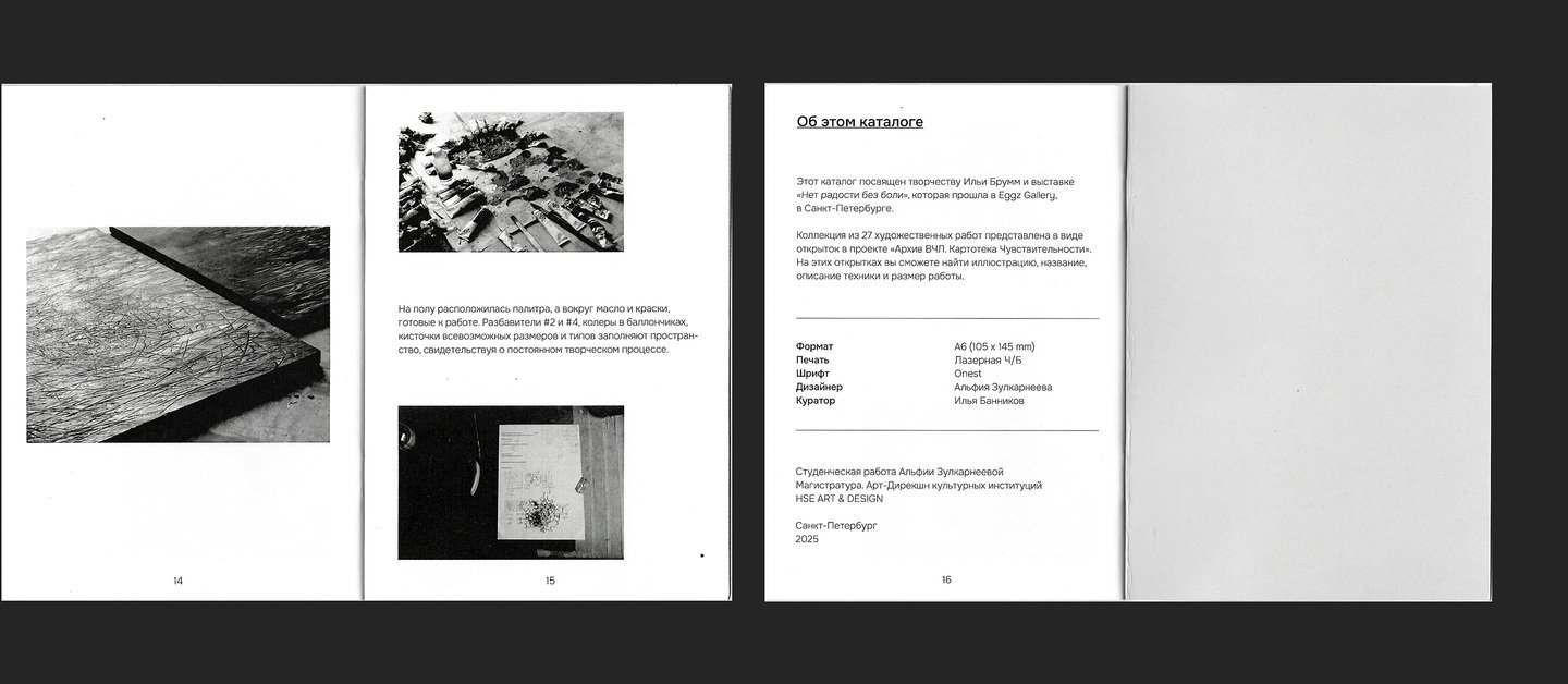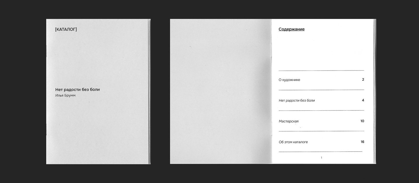 Каталог рассказывает о художнике Илье Брумм, его творческом пути и участии в выставках. Также выключает в себя раздел о выставке «Нет радости без боли», и фоторепортаж с мастерской.