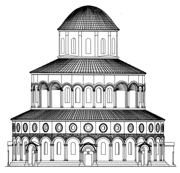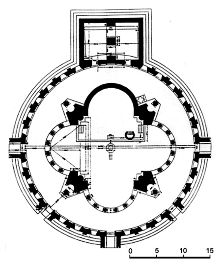 Центричная симметрия: Храм имел три яруса и был симметричен относительно центра. Основой служил тетраконх, вписанный в ротонду.