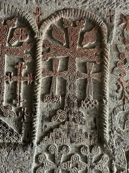 Высеченные в стене хачкары в Гегарде; Хачкары у стен Севанаванка.