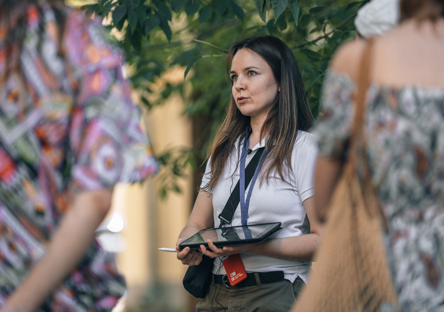 Концепция прогулки задумывалась в формате открытого диалога с художницей, с акцентом на метод работы, движение от идеи проекта до его реализации. Я была рада отвечать на все вопросы, а также услышать мнения участников. Мы обсуждали архитектуру в контексте времени, выставку и мой проект, а также общие вопросы, касающиеся искусства и подходы к нему.