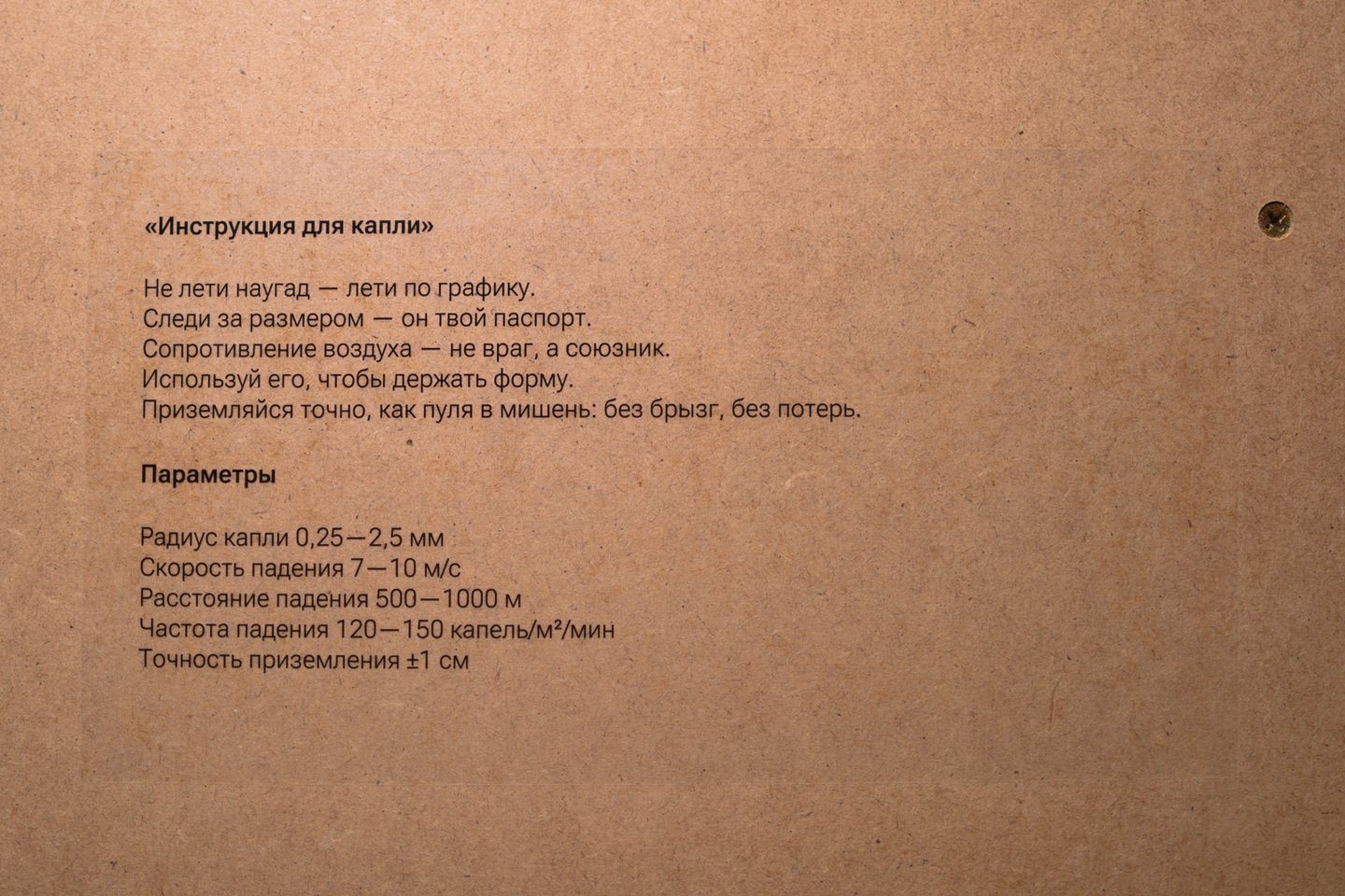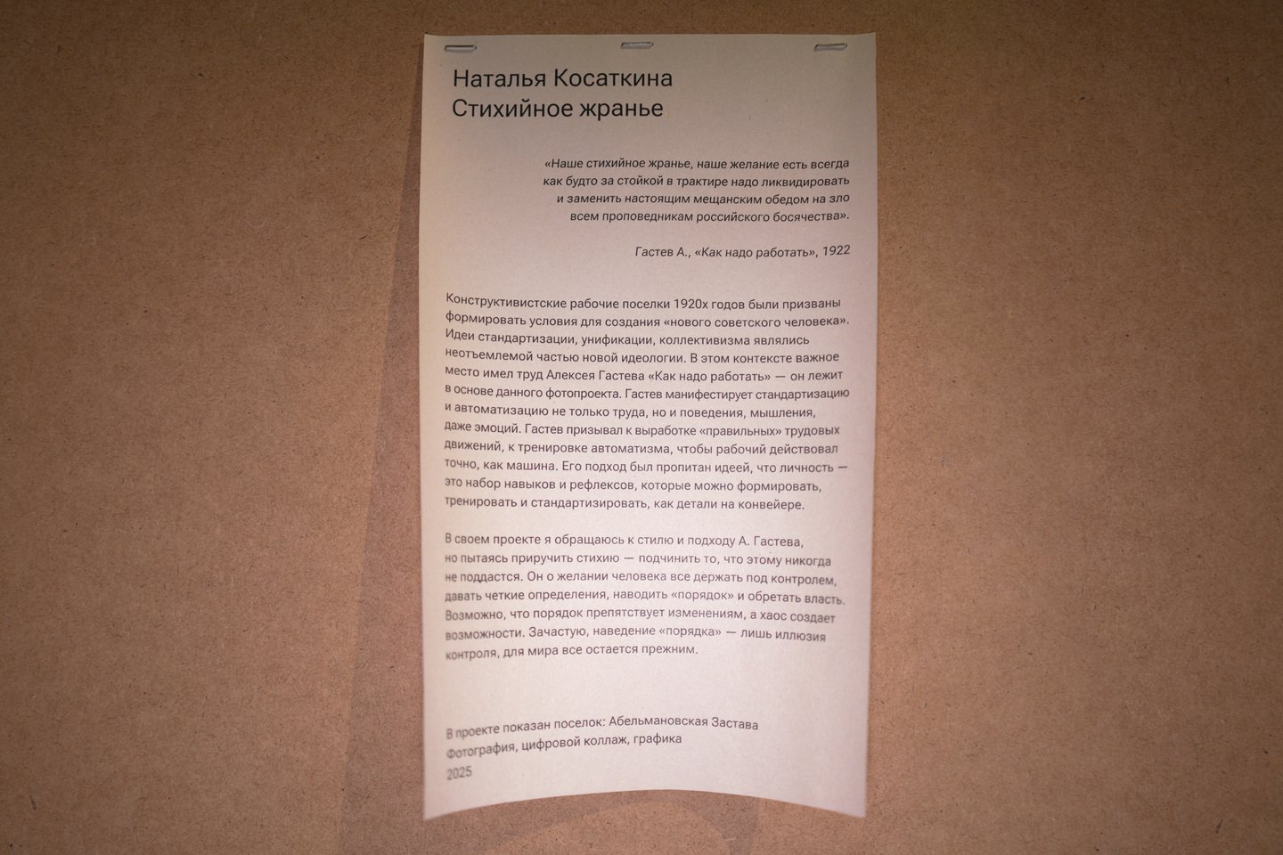 В своем проекте я обращаюсь к стилю и подходу А. Гастева, но пытаясь приручить стихию — подчинить то, что этому никогда не поддастся. Он о желании человека все держать под контролем, давать четкие определения, наводить «порядок» и обретать власть. Возможно, что порядок препятствует изменениям, а хаос создает возможности. Зачастую, наведение «порядка» — лишь иллюзия контроля, для мира все остается прежним.