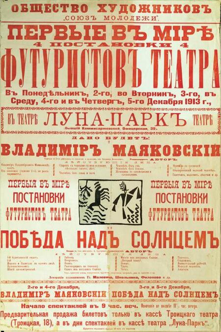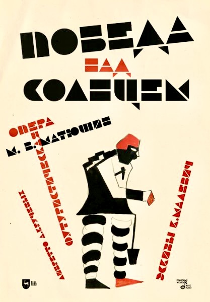 Премьера футуристической оперы «Победа над Солнцем» потребовала афиши, анонсирующей абсолютно новое зрелище. Её дизайн, ещё относительно традиционный, стал точкой отсчёта, визуально связывая зрителя с новаторскими декорациями и костюмами Казимира Малевича.