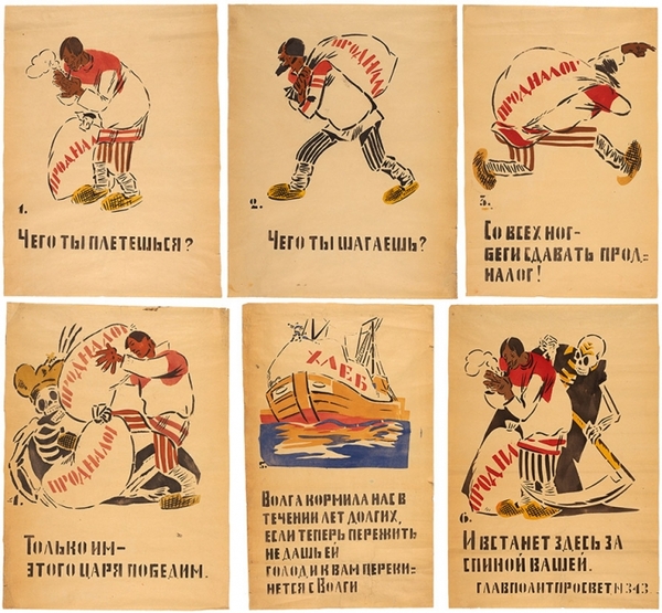 слева: Шестичастный плакат «Окна РОСТА. Промедление — смерть» / сл. В. Маяковского, худ. М. Черемных. М. 1921. справа: «Окна сатиры РОСТА» (Окна РОСТА) — серия плакатов, созданная в 1919–1921 годах