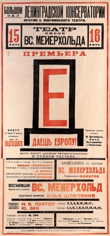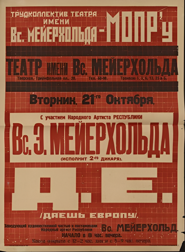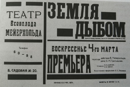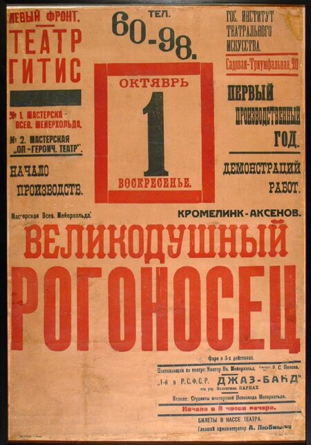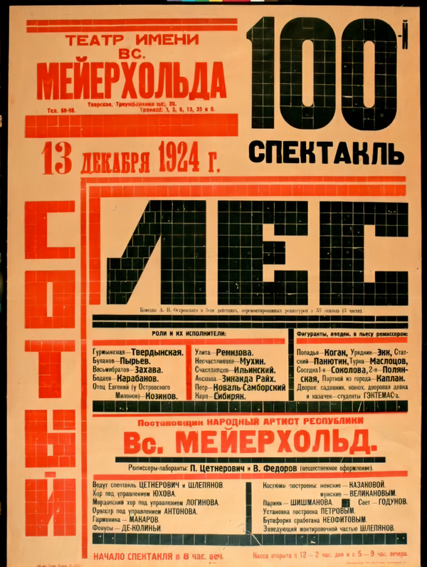 С постановками «Великодушный рогоносец» и «Смерть Тарелкина» в театре Вс. Мейерхольда конструктивизм стал доминирующим стилем. Афиша стала пониматься как инженерная конструкция: композиция строилась на чётких линейных построениях, геометрических фигурах и функциональном шрифте-гротеске, отражая сценографию Любови Поповой и Варвары Степановой.