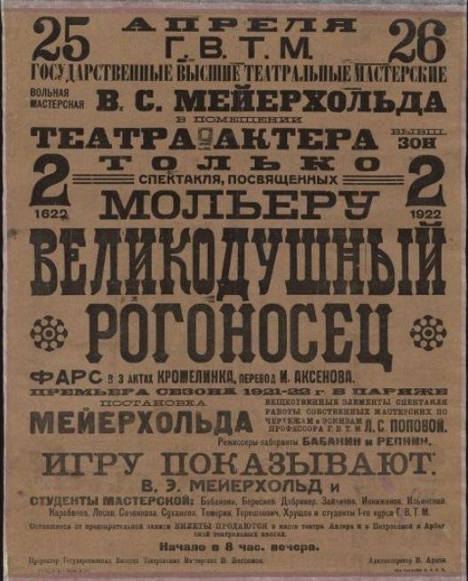 слева: Афиша. Москва, Вольная мастерская В. Э. Мейерхольда. «Великодушный рогоносец» 1 октября 1922 г. справа: Афиша. Москва, Вольная мастерская В. Э. Мейерхольда. «Великодушный рогоносец» 25-26.4.192