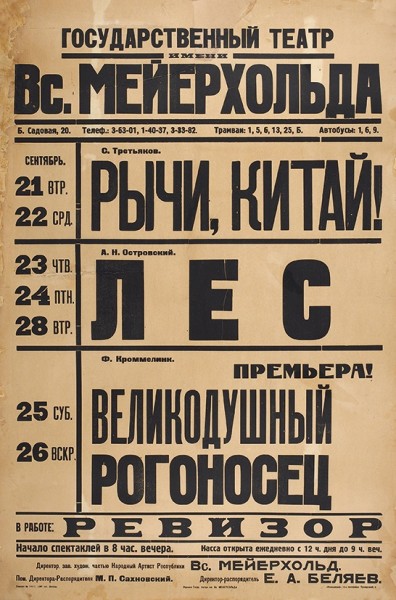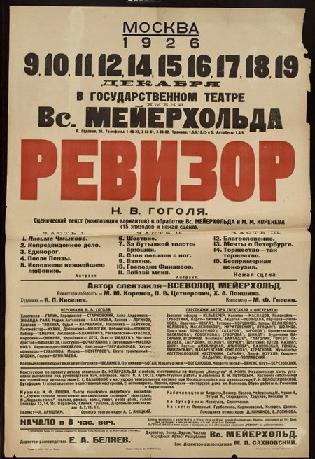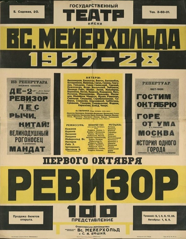 слева: Афиша. Москва, Государственный театр имени Вс. Мейерхольда. «Ревизор» 9–19 декабря 1926 г. справа: Афиша. Москва, Государственный театр имени Вс. Мейерхольда. «Горе от ума»; «Москва» итд. 1927.