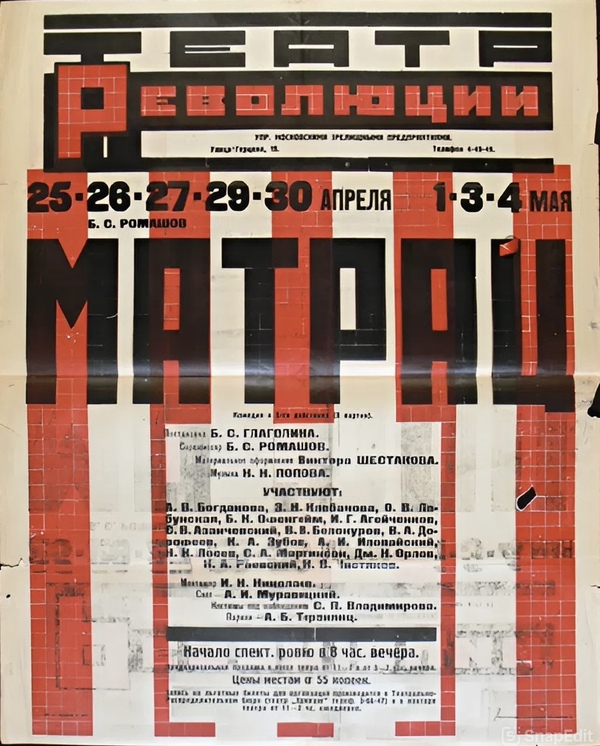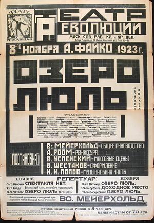 Эстетика ЛЕФа («Левый фронт искусств») провозгласила примат конструирования над изображением. Афиши этого периода делали главным героем шрифт: его размещение, размер и геометрия передавали динамику и содержание спектакля.