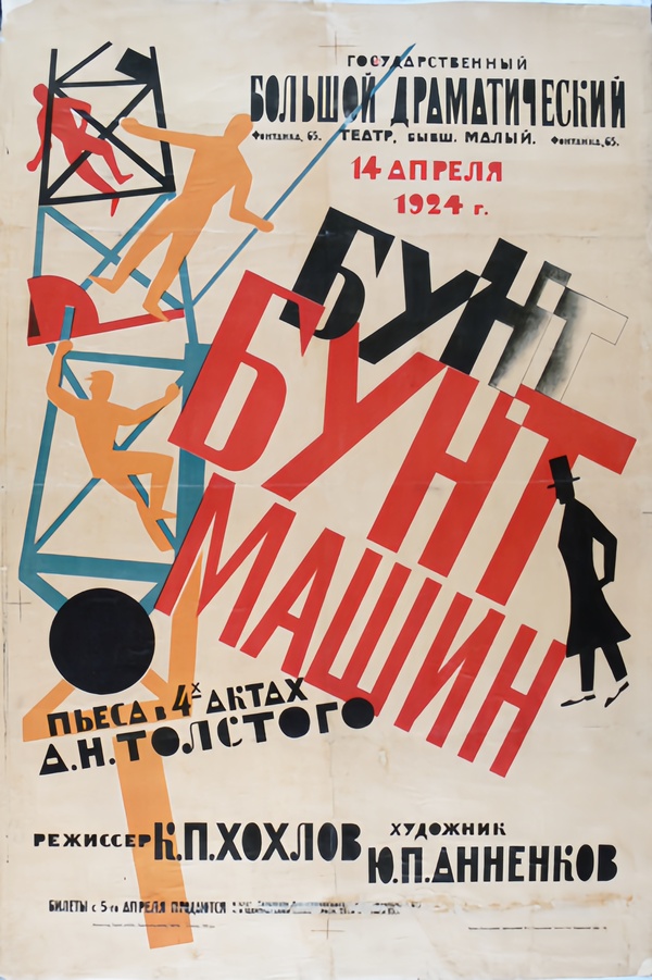 слева: Афиша к спектаклю «Бунт машин» А. Толстого в Большом драматическом театре Ю. Анненков. 1924. справа: Афиша к спектаклю «Матрац» Б. Ромашова в Театре Революции. 1927.