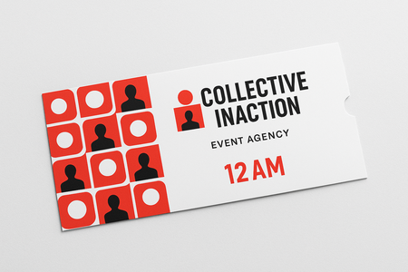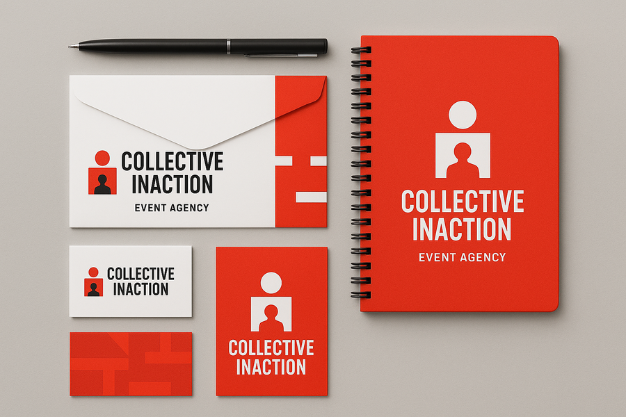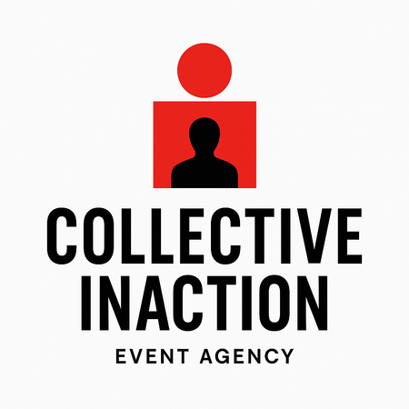 Промпт для логотипа: create a brand logo for an event agency called COLLECTIVE INACTION. Use sans serif condenced font, red white and black colors. Logo must include company’s name, simple geometric forms and minimalistic human silhouette. Модель: ChatGPT-5