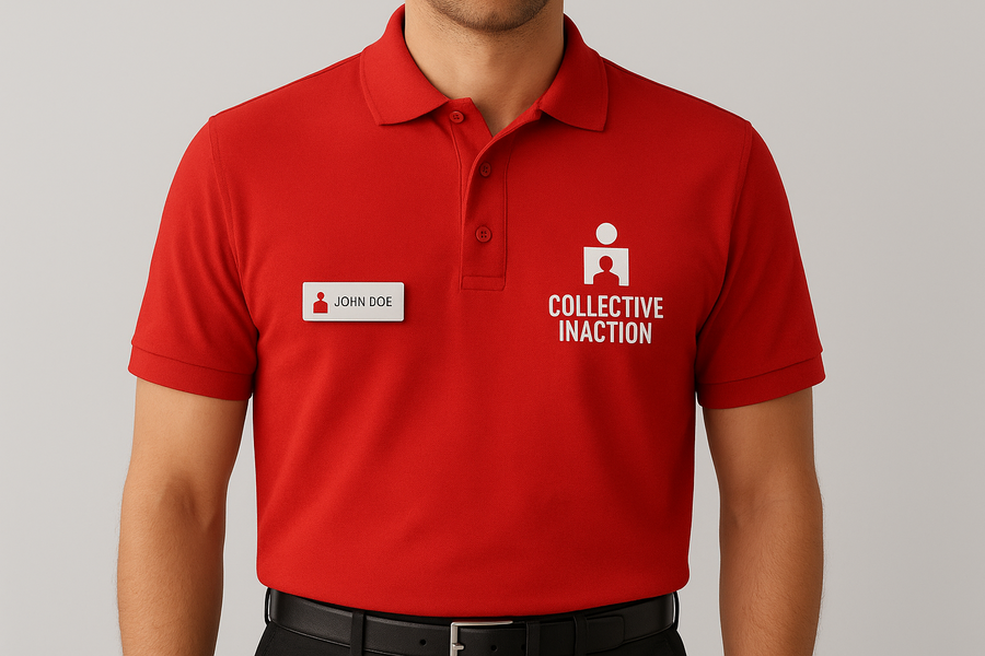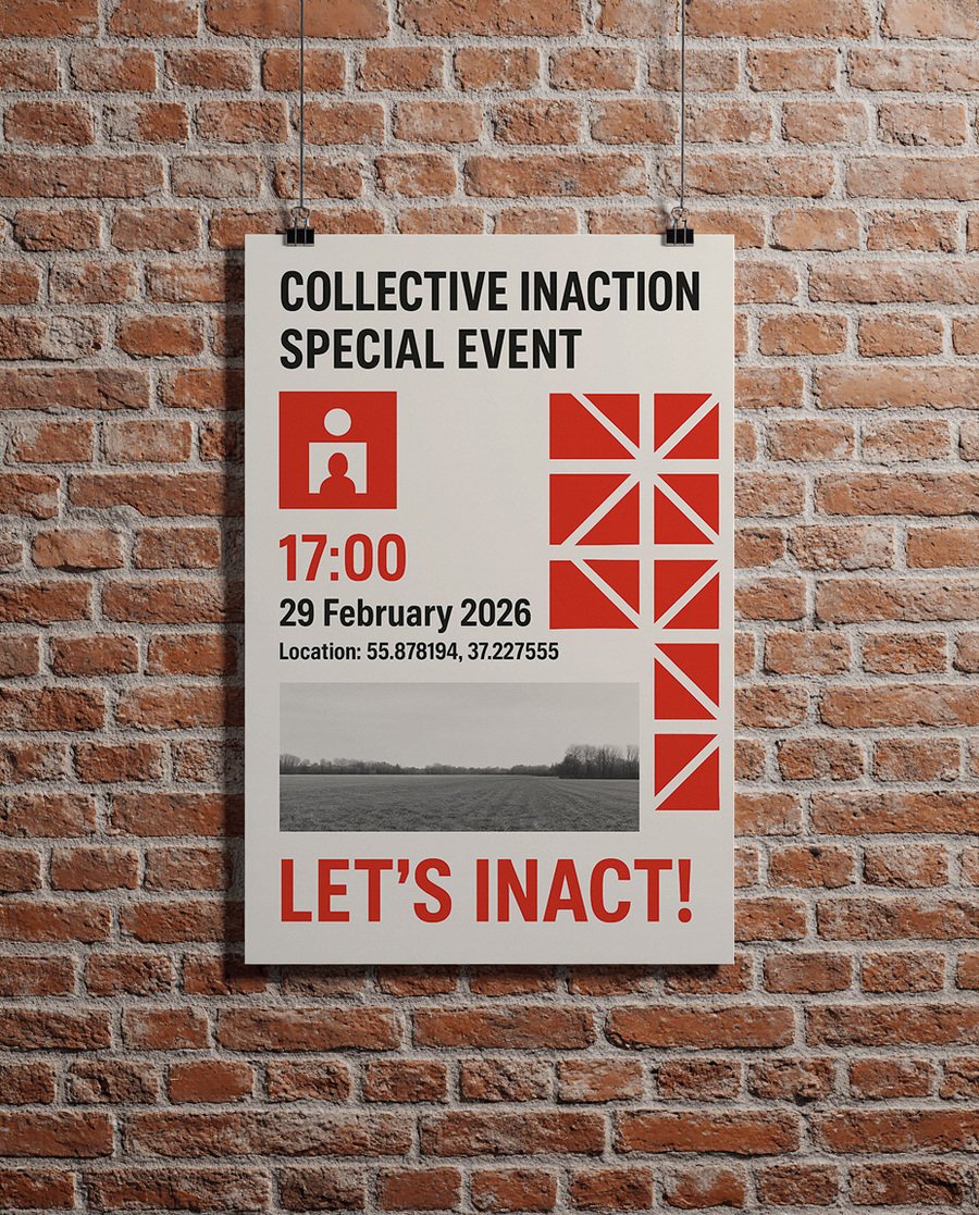 Промпт для канцелярии: make a stationery mockup with this branding. Including pen, envelope, business card, notebook. Use logo and pattern you created earlier for design Промпт для формы: Create an office uniform mockup using this branding Промпт для постера: create a poster promoting event of this agency. Text on the poster must include: COLLECTIVE INACTION SPECIAL EVENT 17:00 29 february 2026 Location: 55.878194, 37.227555 Let’s inact!