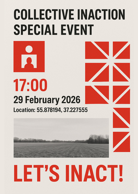 «Коллективное бездействие» — это концептуальное event-агентство, вдохновленное акциями Андрея Монастырского, переосмысляющее подход к проведению массовых мероприятий. В проекте с нейросетями я переосмысляю изначальный дизайн, стараясь сохранить ключевые элементы айдентики.