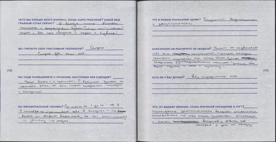перед началом прохождения участник должен заполнить анкету с вопросами, соответствующими тем, которые обычно задают психиатры на первых терапевтических сессиях.