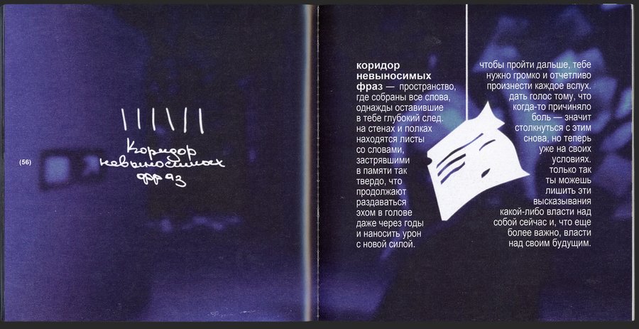 зона с карточками, на которых написаны слова и высказывания, однажды сильно ранившие тебя. для прохождения в следующую комнату необходимо вслух и громко прочитать каждую из них.
