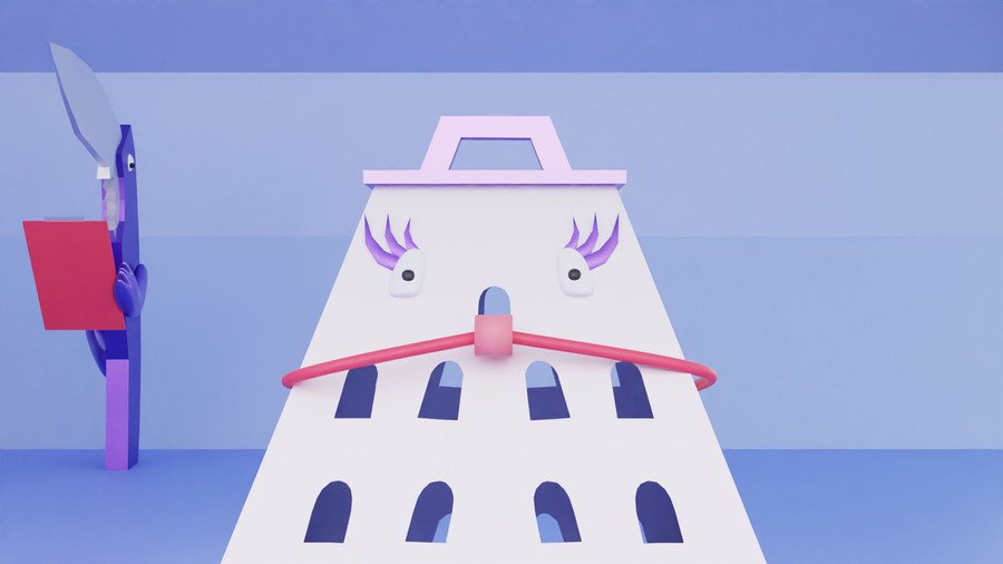 prompt: Cafe building in space style. The image of the building should be photorealistic with a predominance of purple and additional colors of red, orange and blue.