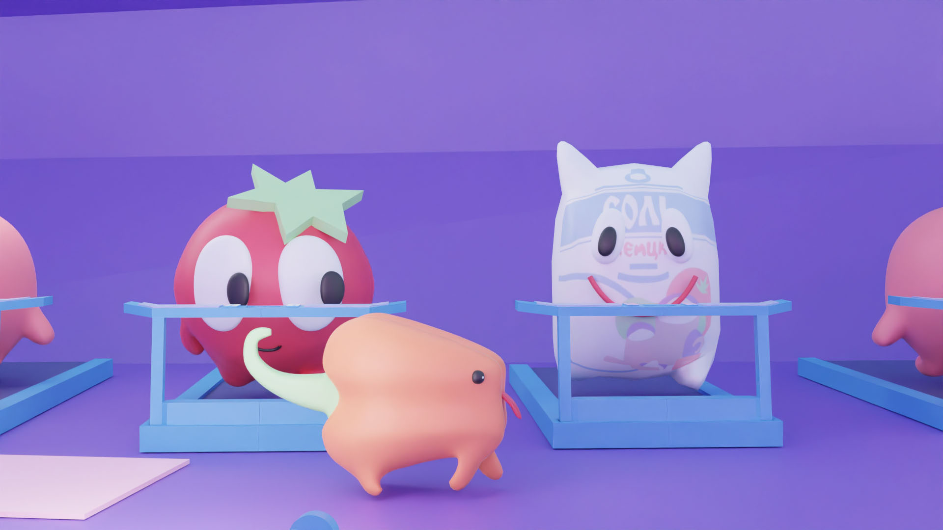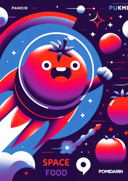 promt: Space snacks in the form of rockets, stars, astronauts, tomatoes. In craft minimalist packaging «Pomidarin» in predominantly purple and additional red, orange and blue colors.