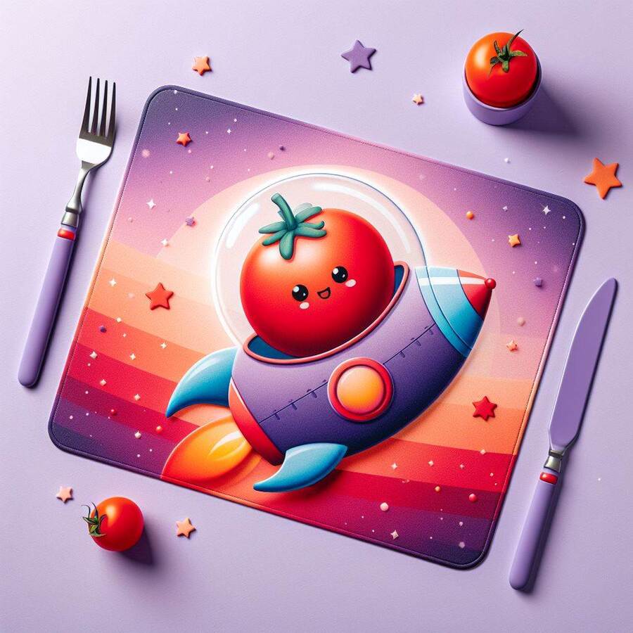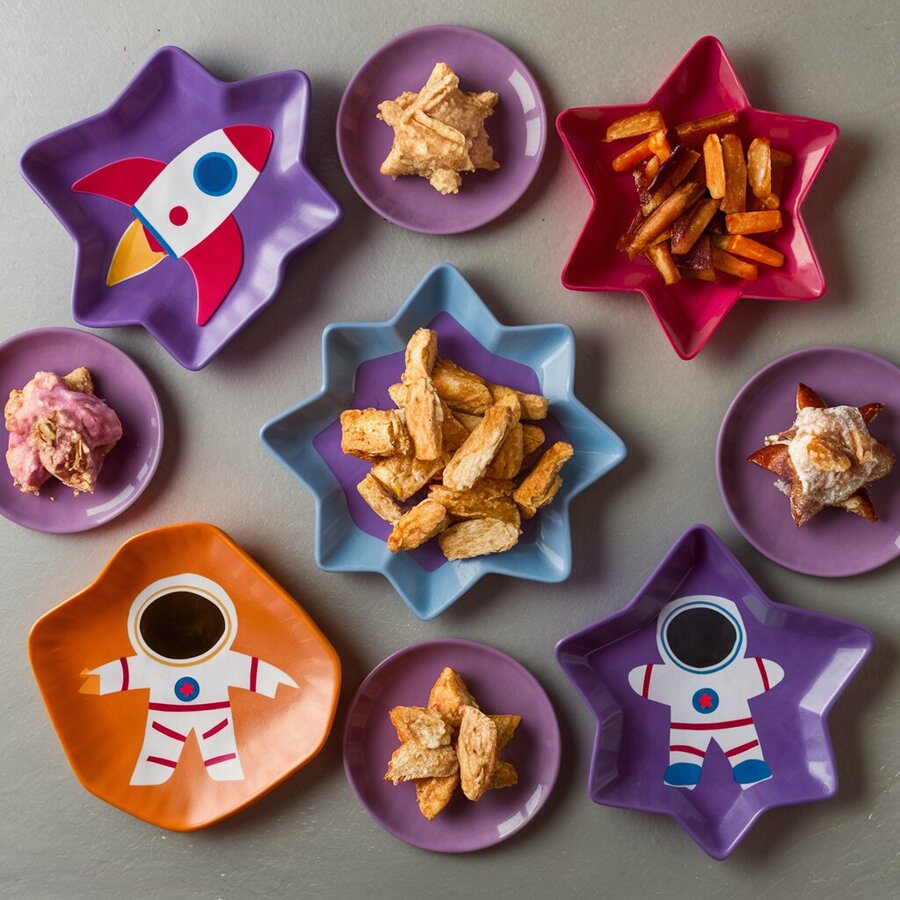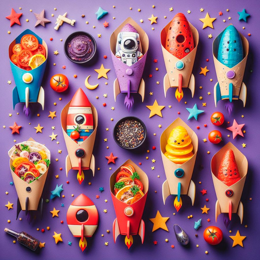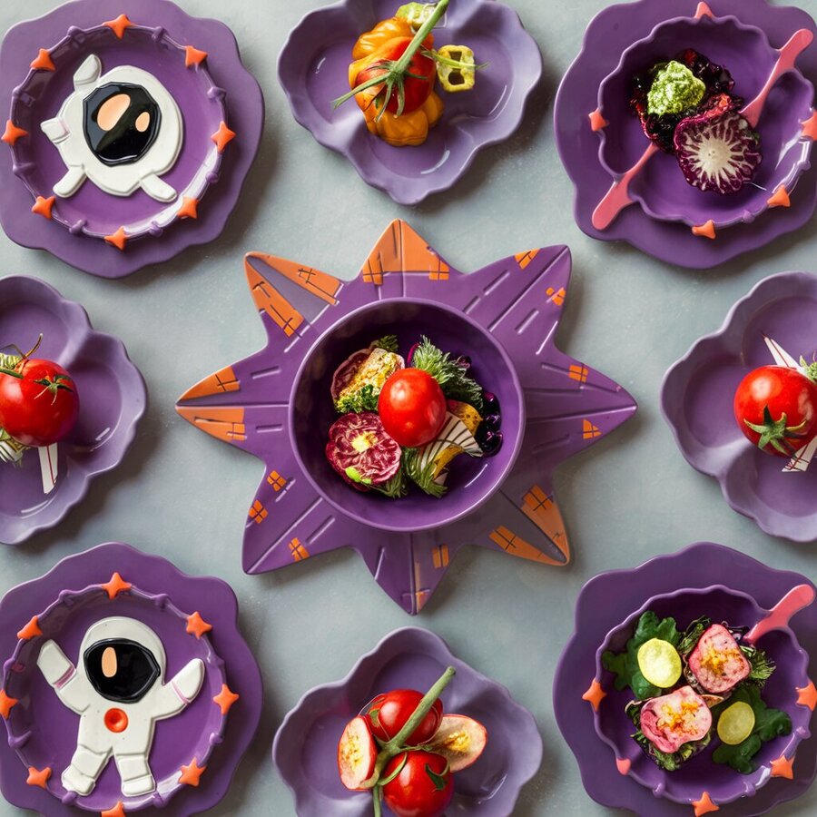 prompt: Plates shaped like rockets, stars, astronauts, tomatoes, mostly purple with additional red, orange and blue. The plates contain food in space style.