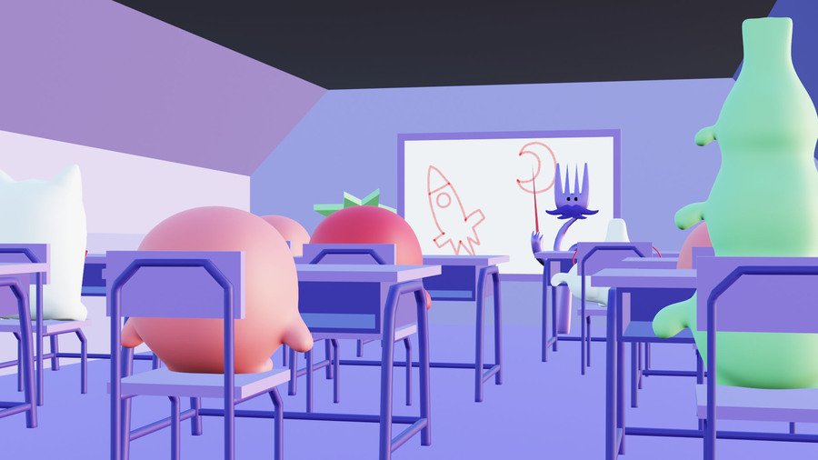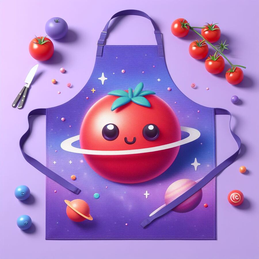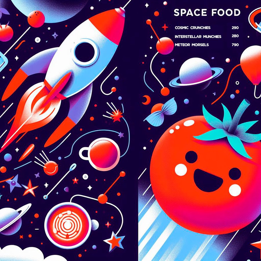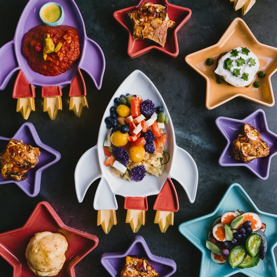 prompt: Plates shaped like rockets, stars, astronauts, tomatoes, mostly purple with additional red, orange and blue. The plates contain food in space style.