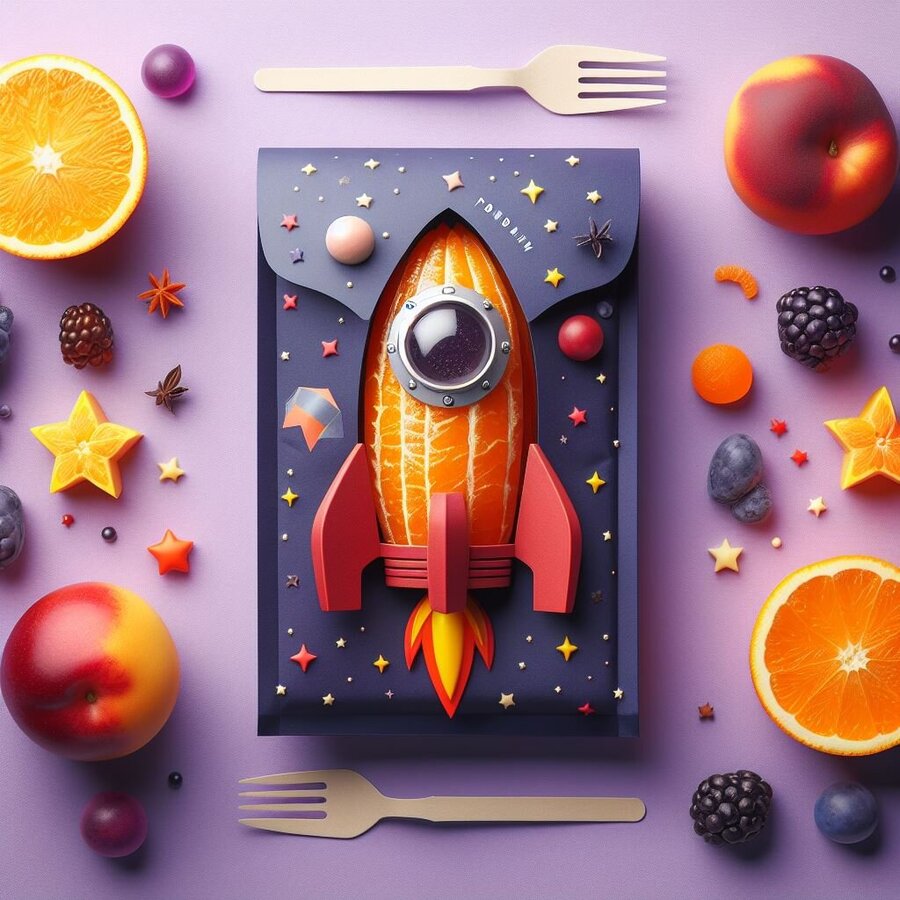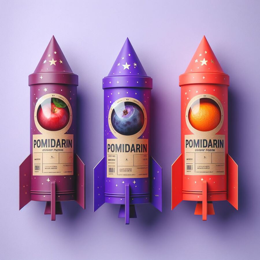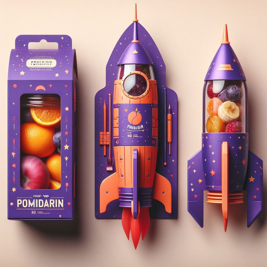 prompt: Street food in space style and in craft minimalistic packaging «Pomidarin» in the shape of a rocket. Predominantly in purple and additional red, orange and blue colors.