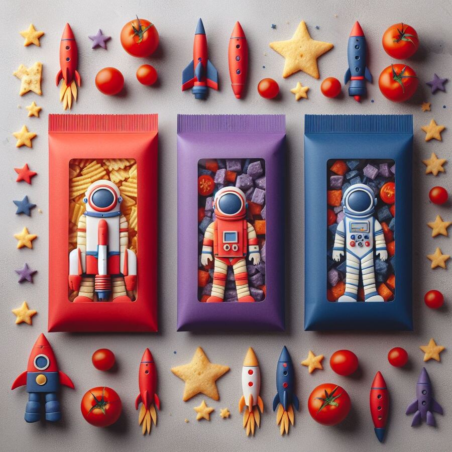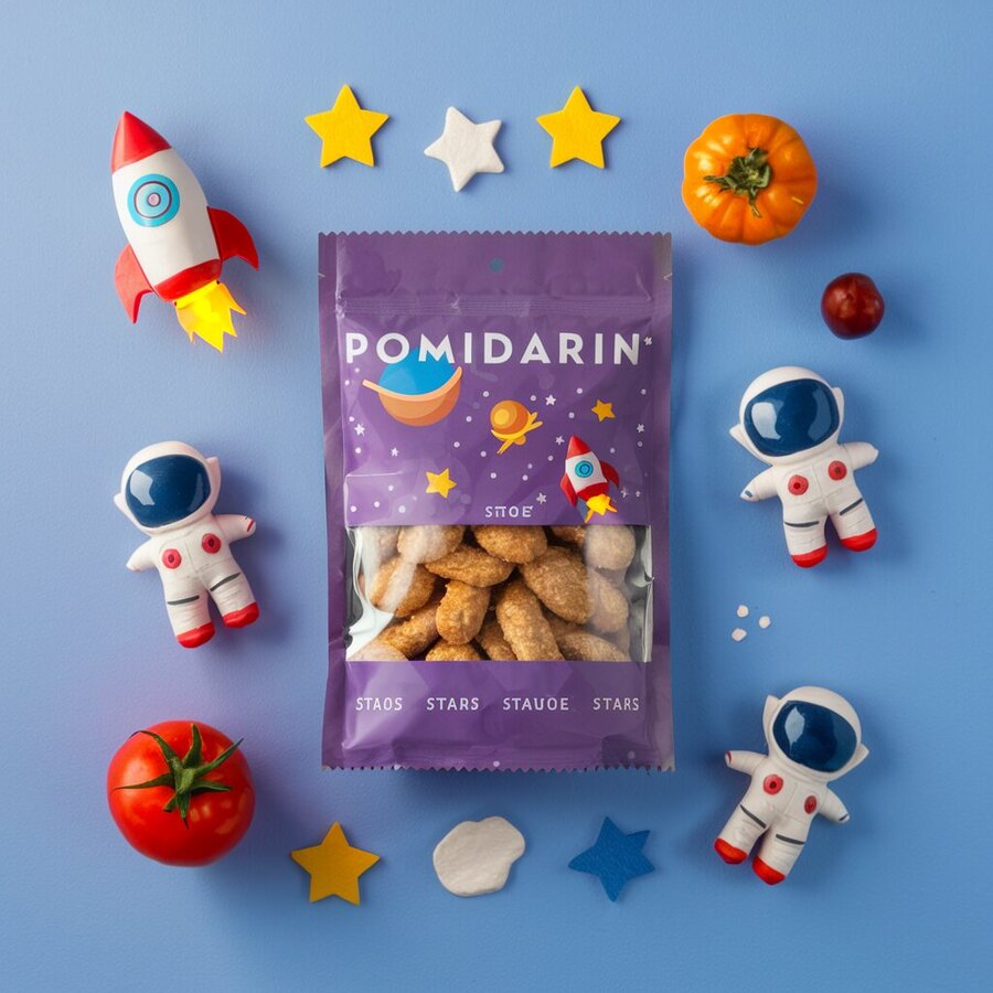 prompt: Space snacks in the form of rockets, stars, astronauts, tomatoes. In craft minimalist packaging «Pomidarin» in predominantly purple and additional red, orange and blue colors.