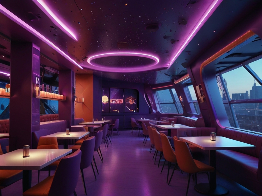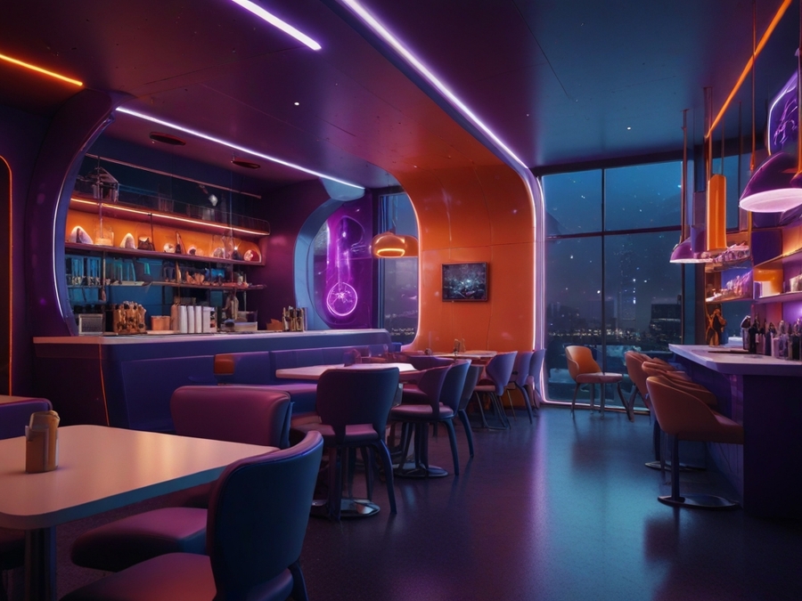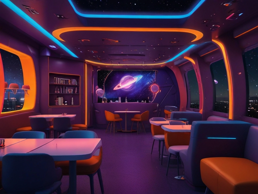 prompt: A bright cafe in space and futuristic style. It should create comfort. Predominantly purple and additional red, orange and blue colors. The interior contains elements of stars and rockets.