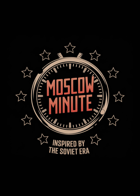 ЛОГОТИП — An illustration of a Soviet-style watch with the text «MOSCOW MINUTE» written in bold, red letters. The watch has a black background and is surrounded by a circle of stars. Below the watch is the text «INSPIRED BY THE SOVIET ERA». The overall design is vintage and has a retro feel.