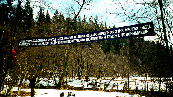 На акции группы «Коллективные действия» под названием «Лозунг 77» участники растянули в лесу красный транспарант, который гласит «Я ни на что не жалуюсь и мне все нравится, несмотря на то, что я здесь никогда не жил и ничего не знаю об этих местах». Формально транспарант — атрибут демонстраций, а лозунг — манифестарное высказывание. Но лозунг КД не манифестирует ничего, хоть и выглядит так, будто должен. И не принадлежит групповому действию в привычном смысле. Сам Монастырский называл свое искусство скорее аполитичным, в акциях КД центральное место занимают темы пустоты и ожидания. Но в акциях «Лозунг 77» и «Лозунг 78» формальные признаки объекта не могут не наталкивать на политическое прочтение произведения, беря во внимание контекст того времени и места.
