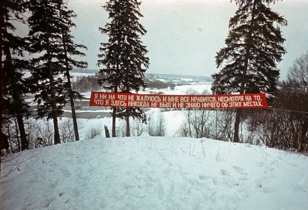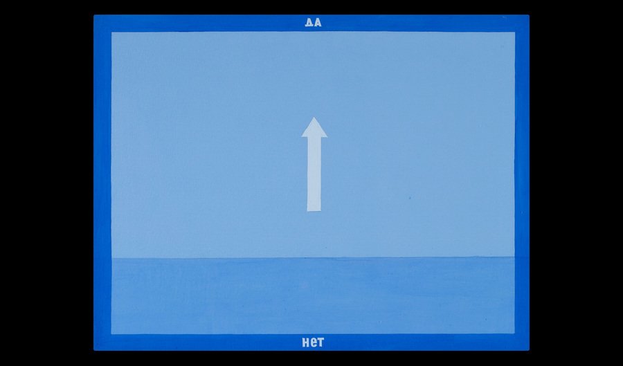 Для Эрика Булатова важна «отделенность» текста от изображения, противопоставление глубины и близости. Плакатные шрифты, ассоциируемые с советской властью, оказываются бесконечно далеки от реального пейзажа, который они перекрывают. Пропагандистским штампам не удается поглотить и присвоить себе то, что чисто и реально — небо, живой пейзаж, свободу.