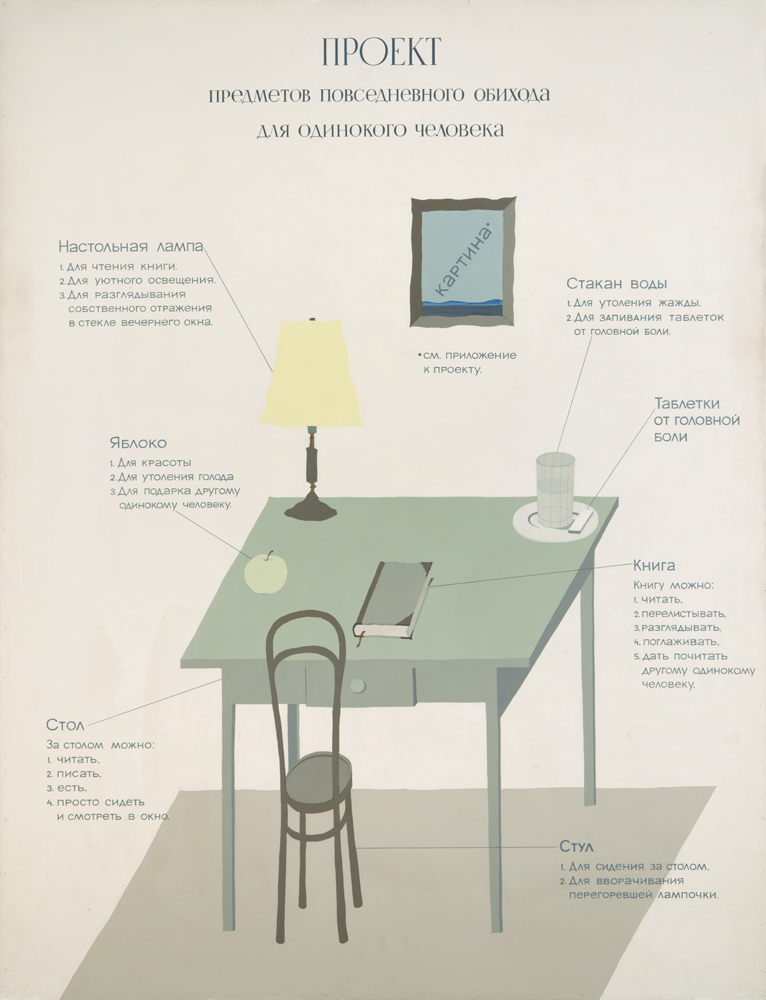 Сухую форму противопожарных информационных стендов использует Виктор Пивоваров в своем цикле «Проекты для одинокого человека». В такой сухой бюрокаратичной форме художник схематично расписывает порядок жизни одинокого человека, под стать форме произведения — безликого и стандартизированного.