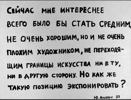 Юрий Альберт сводит к минимуму эстетическую и изобразительную составляющую в своих работах, оставляя только текст. Свой текст. Свои мысли и беспокойства относительно искусства и жизни. Написаны они, в отличие от многих работ московского концептуализма, не каким-то стандартным шрифтом, а рукописным текстом художника, кривоватым и меняющимся от картины к картине. Высказывания Юрия Альберта предельно искренни хоть и не обращены к какому-то конкретному адресату.