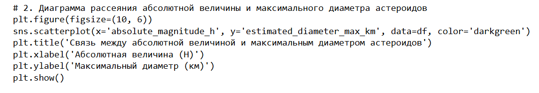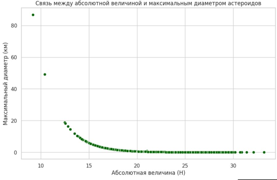 На этом графике явно заметна убывающая функция, есть точная зависимость между максимальным диаметром и абсолютной величиной. Абсолютная звёздная величина показывает блеск астероида. Это значит, что чем больше астероид, то тем больше и его яркость.