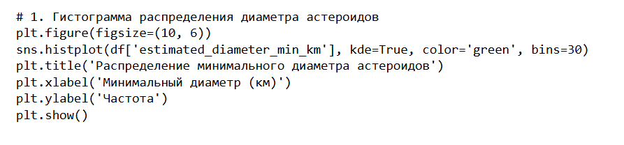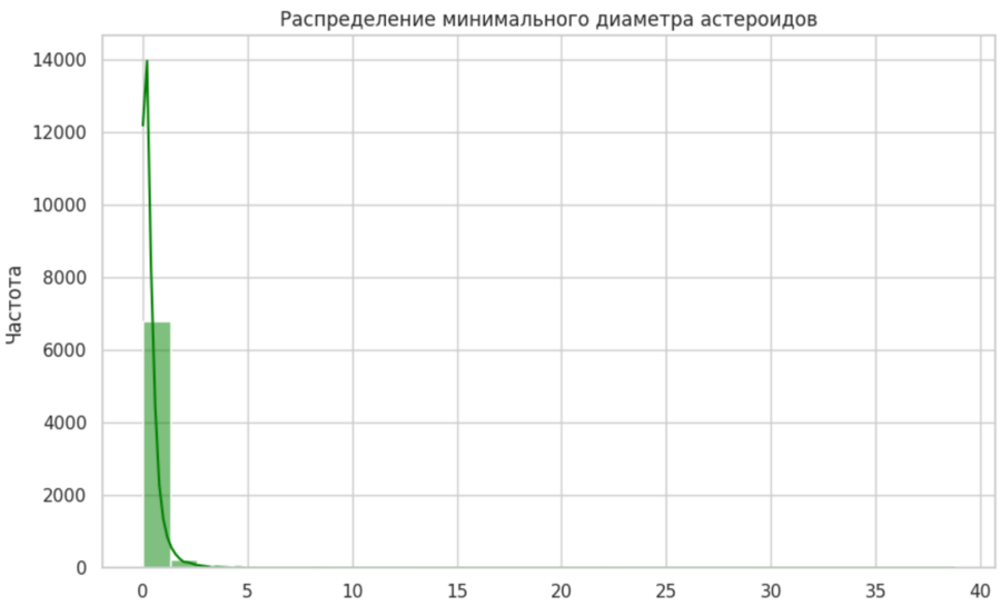 Судя по полученным данным, отображённым на гистограмме напрашивается вывод, что большая часть астероидов обладает очень малым диаметром, вероятно, из-за того, что большие астероиды разбиваются на огромное количество маленьких, из-за чего и получается данная ситуация.