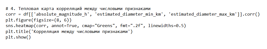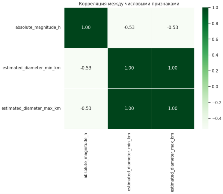 Как и было показано на предыдущих графиках, здесь заметно указано, что есть обратная корреляция между абсолютной величиной и размером астероида, что лишний раз подтверждает этой тепловой карте.