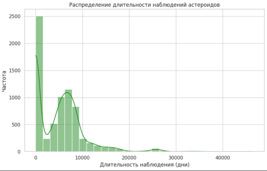 Из этой гистограммы можно заметить, что астероиды крайне часто наблюдается совсем небольшое время, вероятно, именно из-за их преимущественного небольшого размера.