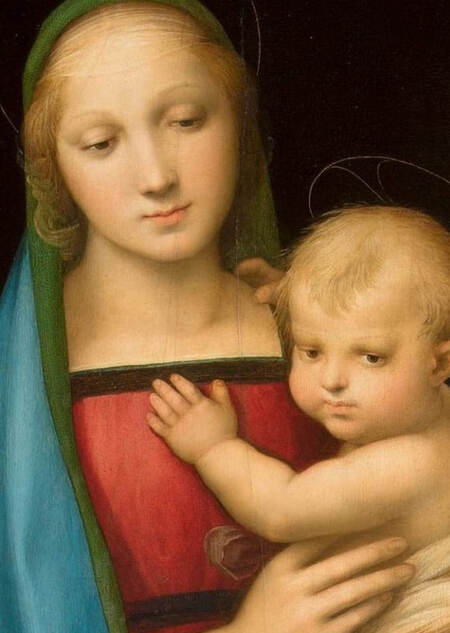 Особым разнообразием иконографии и композиции отличаются образы Марии с Младенцем, написанные Рафаэлем Санти вслед за своим учителем Пьетро Перуджино. Ранние мадонны Рафаэля отображают характерные черты умбрийской живописи периода кватроченто. Их идиллические образы иногда страдают от скованности, сухости и иерархичности. В картинах флорентийского периода наблюдается более непосредственное взаимодействие фигур. Они отличаются сложными пейзажными фонами.