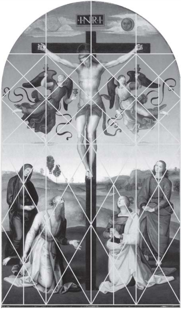Рафаэль в «Распятии с Девой Марией, святыми и ангелами» создает четкую симметрию, деля изображение на две части. Верхняя с ангелами, собирающими кровь Христа в кубки, самой фигурой Христа и изображениями солнца и луны в самом верху работы. Нижняя — четыре фигуры, стоящие попарно (Мария и Иероним слева, Мария Магдалина и Иоанн справа). Граница двух частей проходит по линии облаков, на которых стоят ангелы.