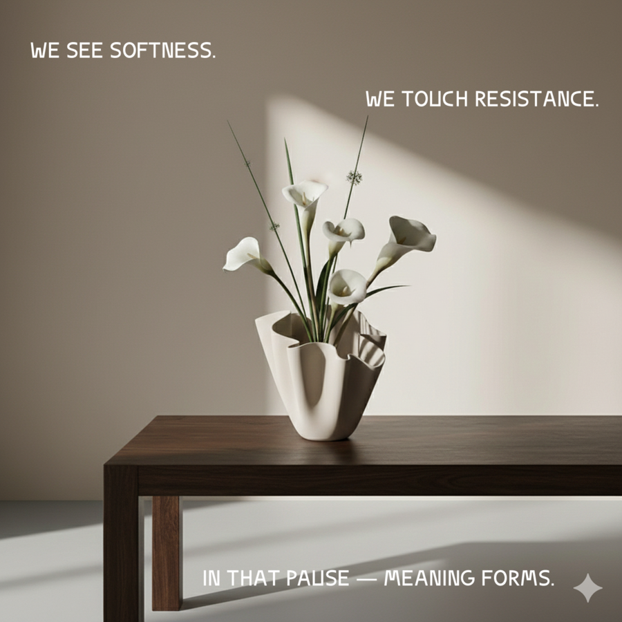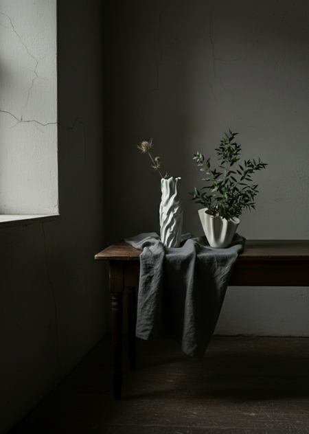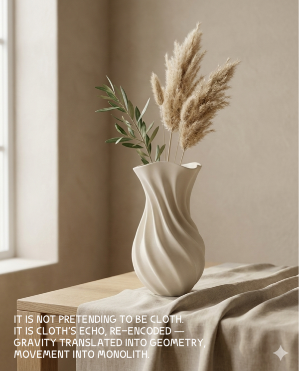 Серия не носит декоративно-исторический характер (не копия барокко или античности), а использует язык драпировки как функциональный приём: форма создаёт устойчивость, определяет пропорции и задаёт способ использования (например, ваза-«платок» удобна для низких композиций, а «рукав» — для высоких стеблей).